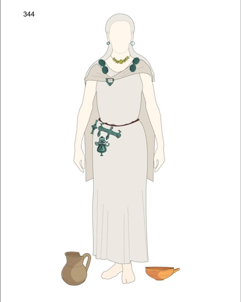 Предмети: Наочареста фибула од гроб 344, локалитет Лисичин Дол, с. Марвинци, Валандовско, 7-6 век пред н.е. претставени на реконструкција на девојка од локалитетот Лисичин Дол, с. Марвинци, Валандовско
