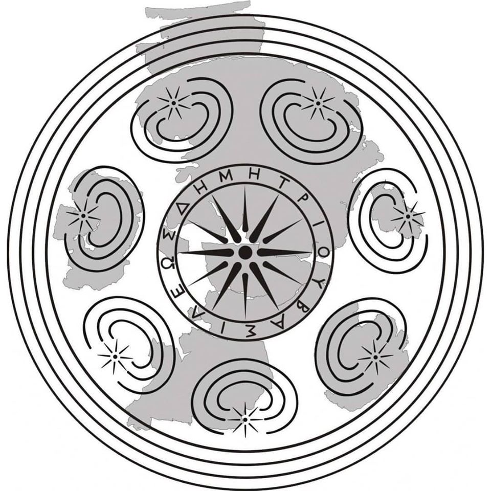 👉 Штитот e со кружна форма, полусверичен и на него е претставена карактеристичната иконографија на т.н. македонски тип на штит. Во средишниот дел е претставено дванаесеткрако сонце, а околу него во посебно прстенесто поле се чита натписот ΒΑΣΙΛ[ΕΟΣ] ΔΗΜΗΤΡΙΟ[Υ] – во превод КРАЛОТ ДЕМЕТРИЈ. Во периферниот дел на штитот се претставени седум српести полиња во чија средина се изведени осумкраки ѕвезди.