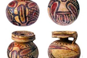 👉Арибалос е мало сатче во кое се чувало миризливо (парфимирано) масло. Вакви сатчиња се произведувале во градот Коринт, во Хелада, а неговото име е хеленски збор со значење топка/топчест. Поради ваквата форма, ова сатче се врзувало со кожна врвка или јаже, се носело врзано околу појасот или раката (како што е прикажано на фотографијата) или закачено во тоалетното катче на сопственикот. Арибалосот го користеле и атлетите (борачите), како шишенце за маслото со кое се мачкале пред натпреварот. Популарноста на арибалосот била најголема околу средината на VI век пред н. е., а токму од тоа време е и нашиот арибалос, случајно откриен во населбата Тафталиџе во Скопје.