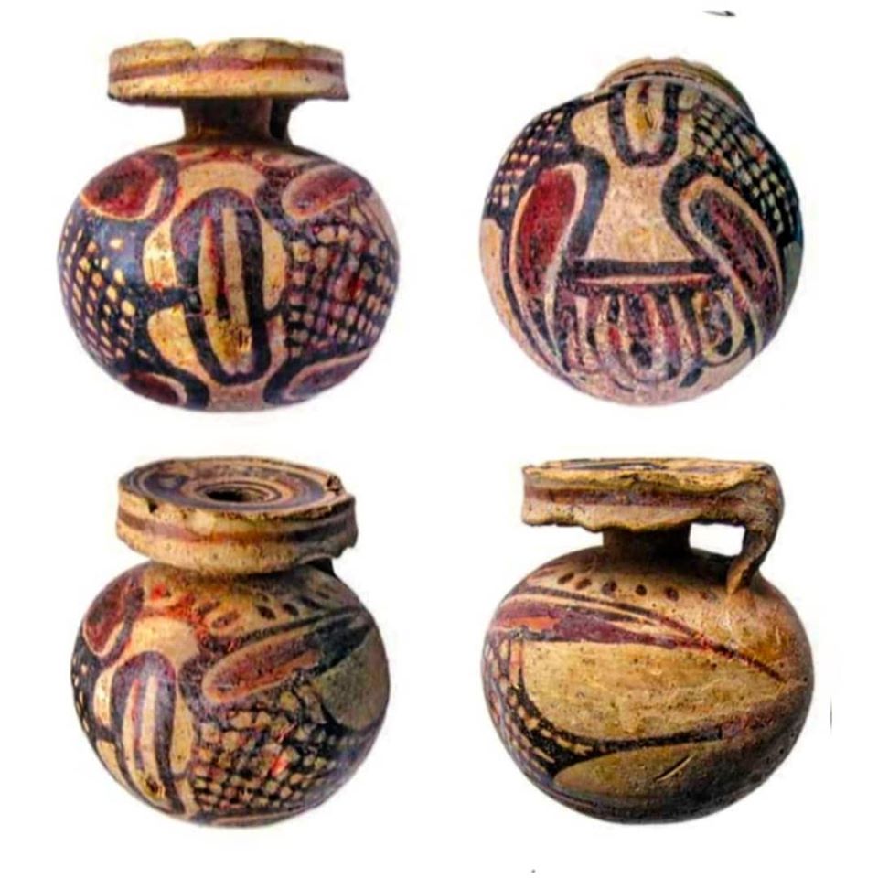 👉Арибалос е мало сатче во кое се чувало миризливо (парфимирано) масло. Вакви сатчиња се произведувале во градот Коринт, во Хелада, а неговото име е хеленски збор со значење топка/топчест. Поради ваквата форма, ова сатче се врзувало со кожна врвка или јаже, се носело врзано околу појасот или раката (како што е прикажано на фотографијата) или закачено во тоалетното катче на сопственикот. Арибалосот го користеле и атлетите (борачите), како шишенце за маслото со кое се мачкале пред натпреварот. Популарноста на арибалосот била најголема околу средината на VI век пред н. е., а токму од тоа време е и нашиот арибалос, случајно откриен во населбата Тафталиџе во Скопје.