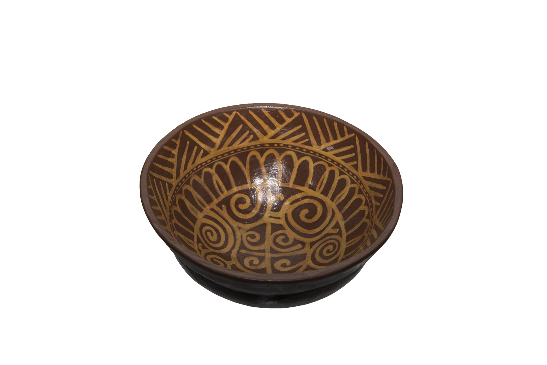 Чинијата е со ниско прстенесто дно и косо извлечен проширен обод, со заоблен раб. Внатрешната површина е премачкана со кафеава боја, а врз неа на дното и во средишниот дел, со жолта боја, извлечени се спирални елементи, а во горниот дел има коси линии кои формираат триаглести површини. Однадвор на работ, (околу ободот) чинијата е украсена со полукружни брановидни линии.