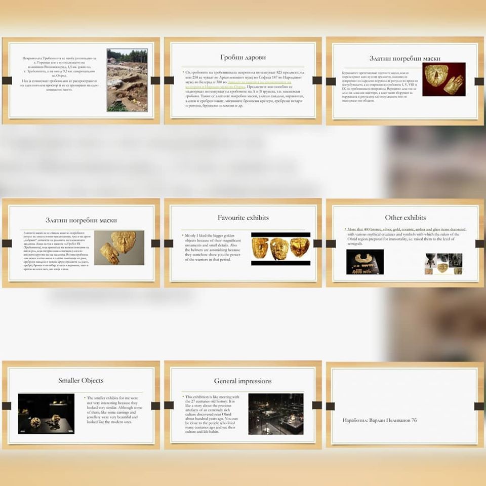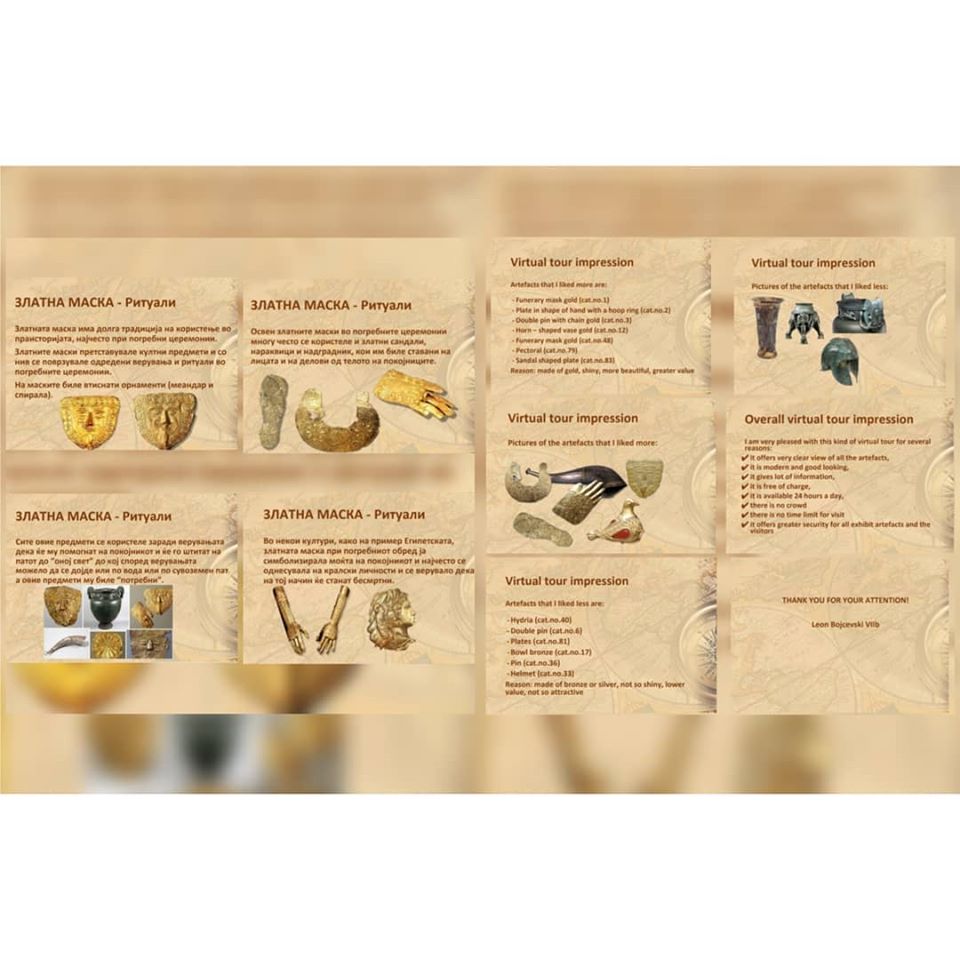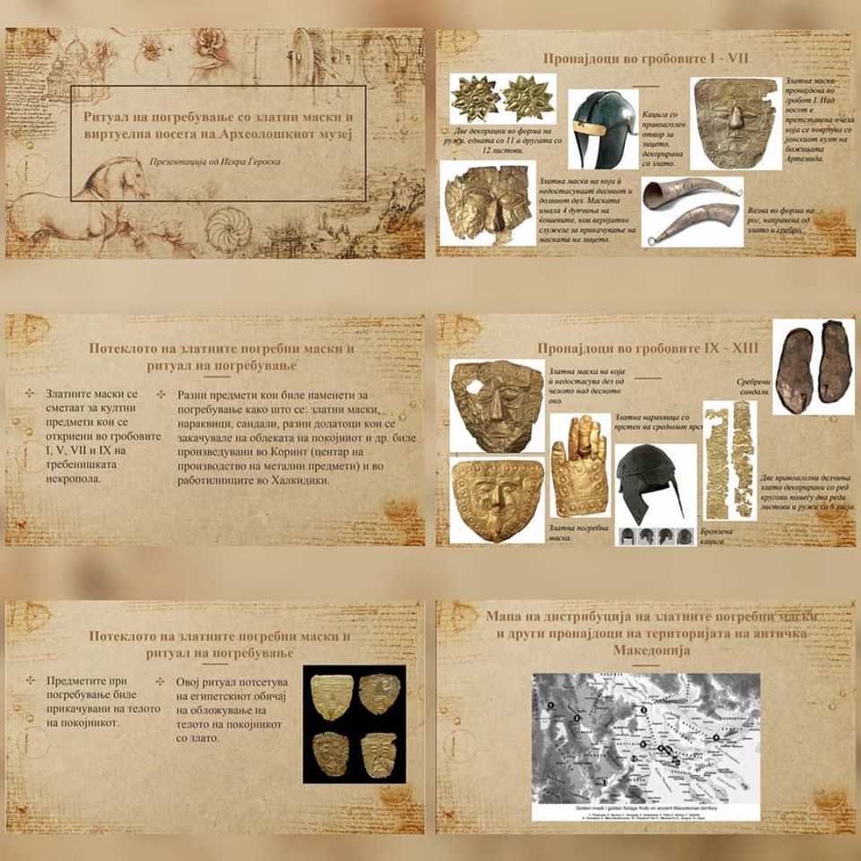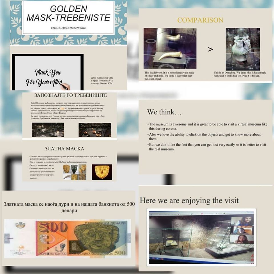 Под менторство на наставничката по историја Калина Серафимовска и наставничката по англиски јазик Камелија Симоновска, со интегрирање на овие два предмети, учениците изработија презентации во кои опишуваат реален ритуал со златната маска, а на англиски ги искажуваат своите впечатоци издвојувајќи артефакти што повеќе или помалку им се допаднале, како и впечатоци од виртуелната посета. Освен презентациите добивме и прекрасен цртеж на кој е нацртана златната маска.