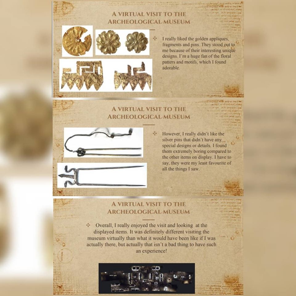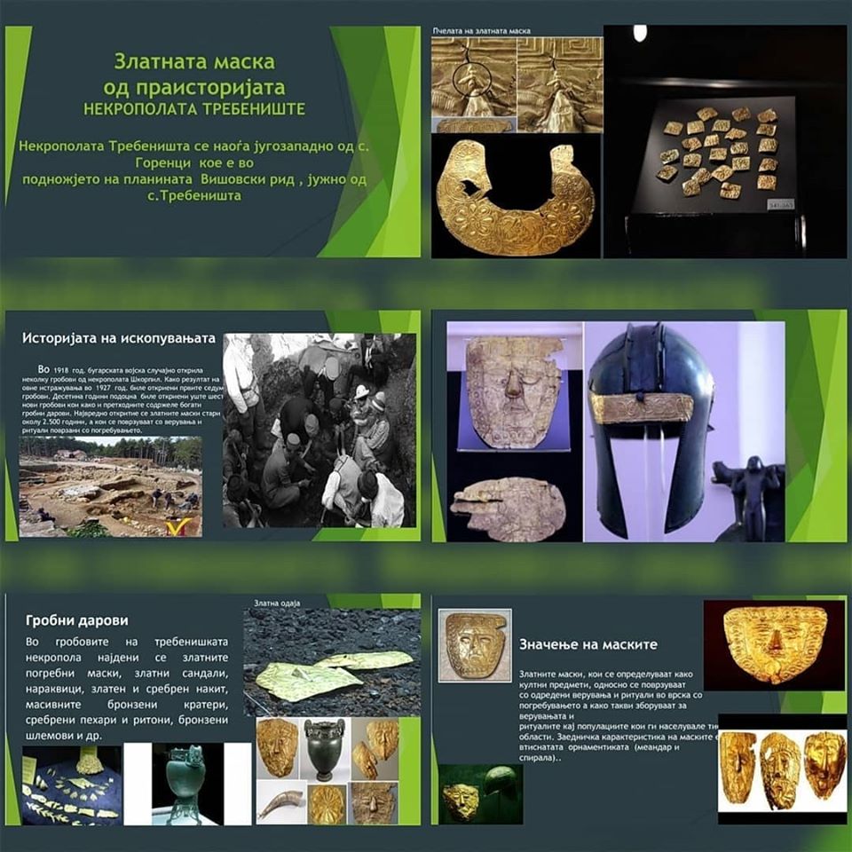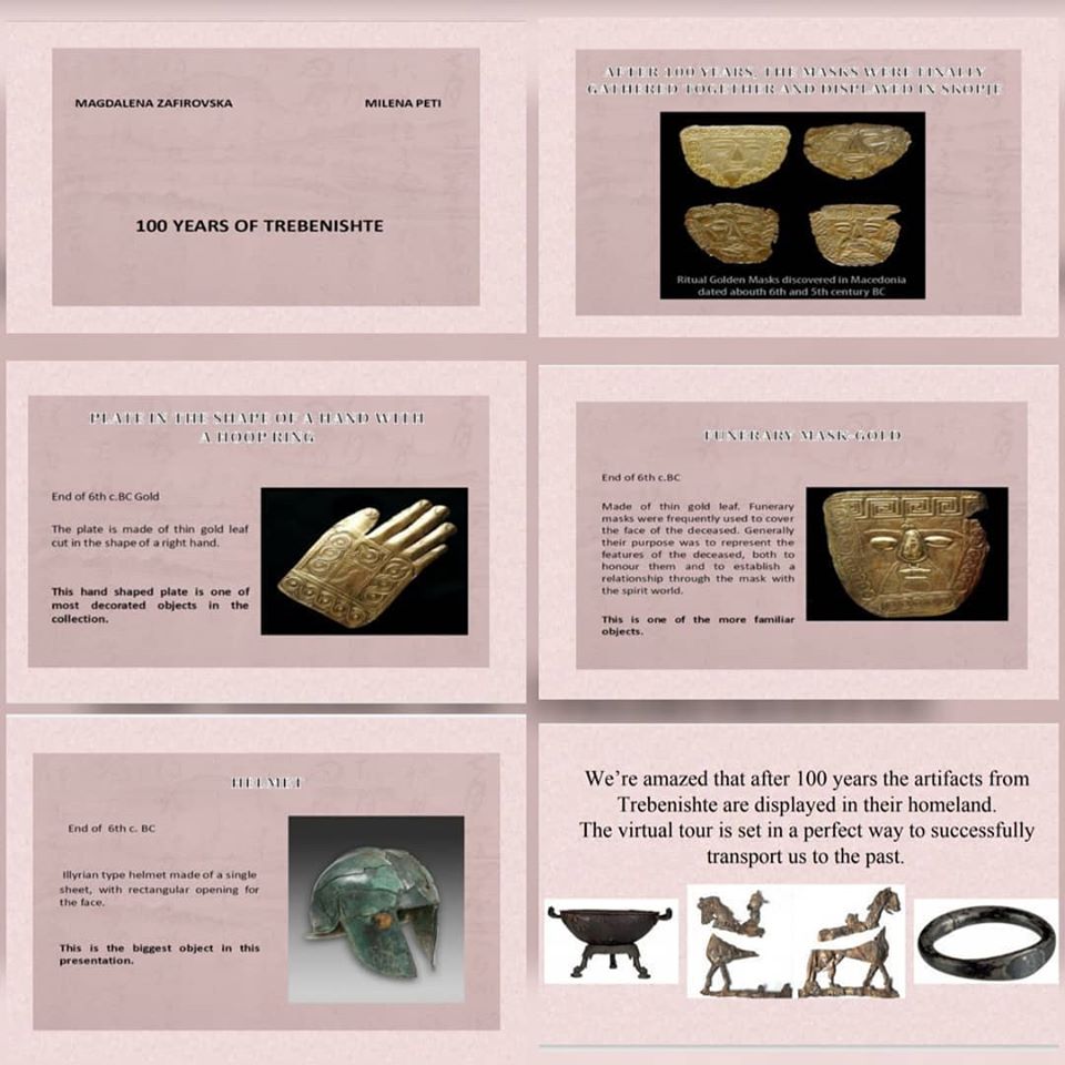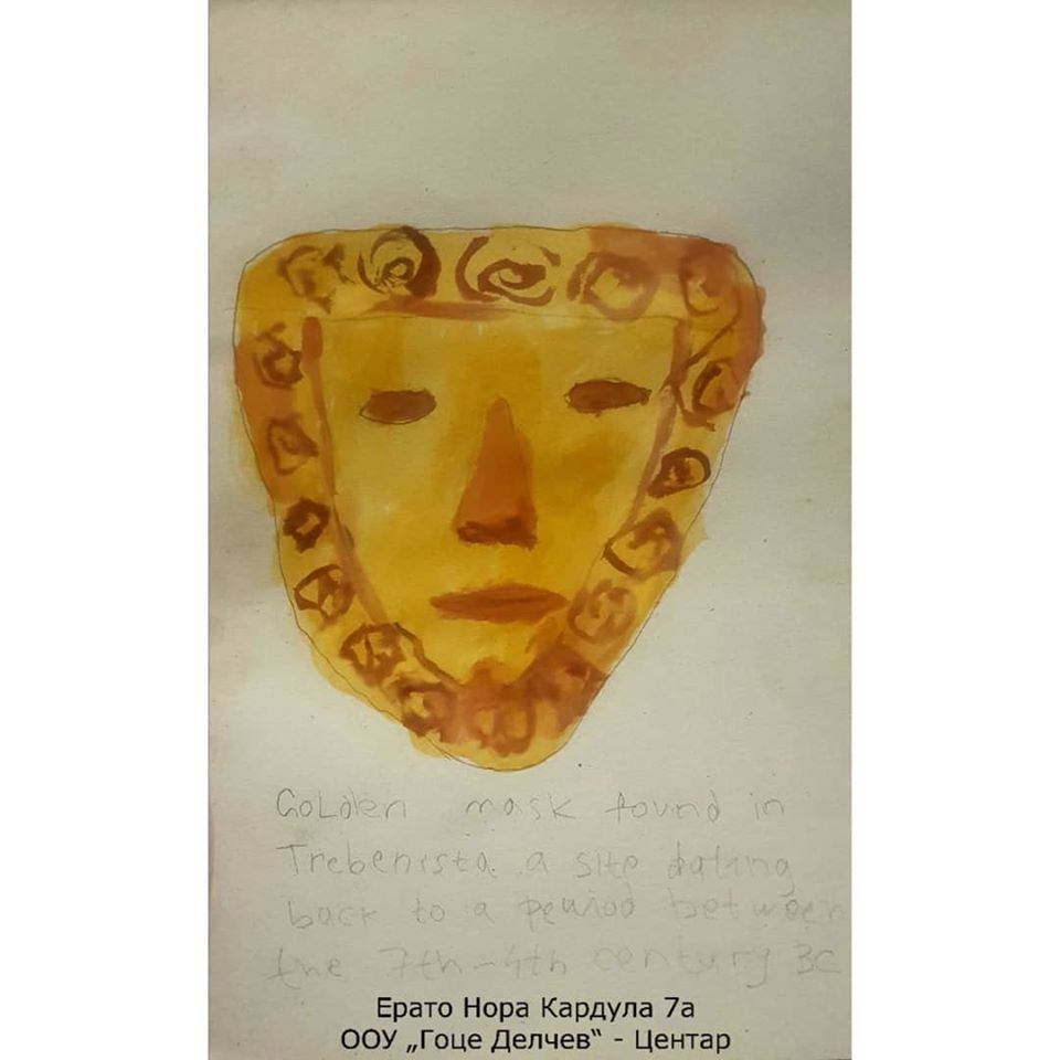 Под менторство на наставничката по историја Калина Серафимовска и наставничката по англиски јазик Камелија Симоновска, со интегрирање на овие два предмети, учениците изработија презентации во кои опишуваат реален ритуал со златната маска, а на англиски ги искажуваат своите впечатоци издвојувајќи артефакти што повеќе или помалку им се допаднале, како и впечатоци од виртуелната посета. Освен презентациите добивме и прекрасен цртеж на кој е нацртана златната маска.